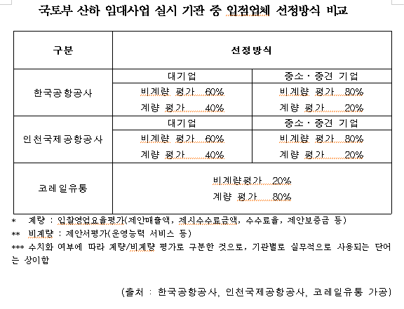 국토부 산하기관 중 임대업을 병행하고 있는 인천국제공항공사, 한국공항공사의 경우 계량평가의 비중은 20%에 불과했고, 운영능력 서비스 등을 평가하는 비계량평가의 비중이 80%를 차지해 코레일유통과 현격히 비교됐다.