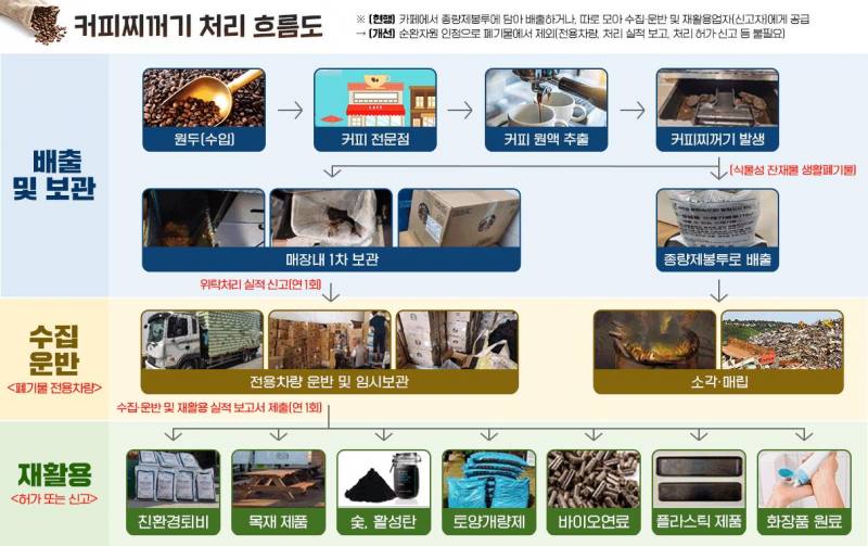 커피 소비량 증가에 따라 국내 발생되는 커피 찌꺼기 또한 최근 1.6배 가까이 급증하였으나, 허가를 받거나 신고한 폐기물처리업체만이 수거․처리할 수 있는 등 폐기물 관련 규제로 인해, 늘어난 배출량을 적극 재활용하는 데에는 제약이 있었다.