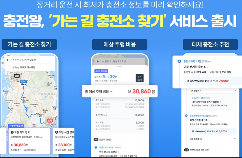 가는 길 충전소 찾기 서비스는 여행이나 출장 등 장거리 운전 시 경로 내 충전소별 최저가 정보를 안내해 가장 저렴한 충전소를 이용할 수 있게 했다. 충전소 정보뿐만 아니라 경로 중 가장 가까운 대체 충전소도 추천해 주며 혹시 모를 상황까지 대비할 수 있게 했다. 또 목적지까지 예상 충전 요금, 주차 요금, 톨게이트 요금까지 총 예상 주행 비용도 미리 알려준다.
