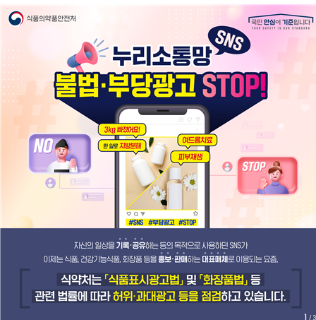 식약처관계자는 “새로운 광고 형태로 자리를 잡은 누리소통망을 대상으로 온라인 광고 점검 등 모니터링을 지속 강화하여 온라인 불법 광고를 근절하기 위해 최선을 다 하겠다고 말했다.