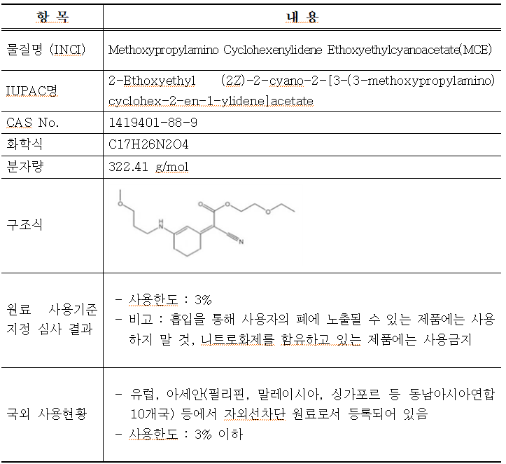 이에 대한 법적 근거가 마련된 ‘18년 이후 최초로 신규 자외선 차단 원료 에 대한 사용기준 지정 신청이 접수되어 안전성 및 유효성 등에 대한 제출자료를 검토한 결과 사용 타당성이 인정되며, 해당 원료의 목록, 사용기준등을 홈페이지에 공고 하고 고시에 반영할 계획입니다.