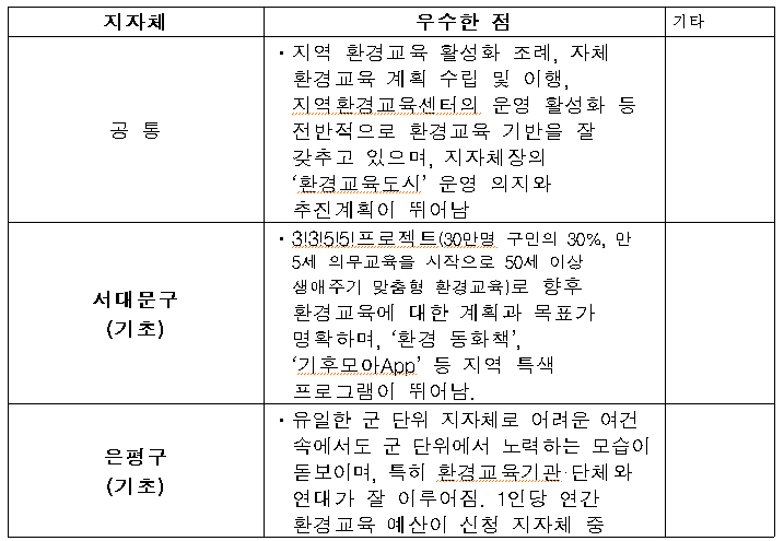 이번에 선정된 6곳의 지자체들은 지역 환경교육 활성화 조례, 자체 환경교육 계획 수립 및 이행, 지역환경교육센터의 운영 활성화 등 전반적으로 환경교육 기반을 잘 갖추고 있다. 또한 환경교육도시 운영을 통해 탄소중립을 실현하려는 지자체장의 의지도 매우 높았다.