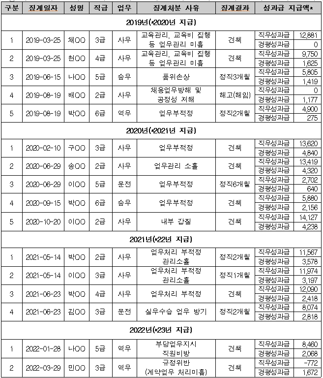 그러나 지난 2020년 10월 국민권익위원회는 징계 사유에 상관없이 처분 결과가 파면, 해임, 정직, 감봉 등 중징계에 해당하면 성과급을 주지 말라고 권고한 바 있다. 또한 중징계가 아니더라도 금품·향응수수, 성 비위, 음주운전에 해당하여도 성과급을 줘선 안 된다고 규정한 바 있다.
