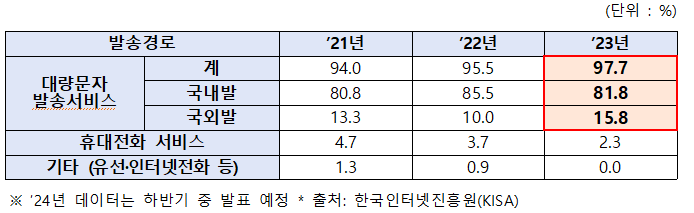 문자 스팸 발송경로는 대량문자발송서비스가 97.7%로 대부분을 차지하고 있으며, 국내 발송비율은 81.8%, 국외 발송비율은 15.8%다. 국내발 대량문자발송 문자스팸 유형은 도박(43.6%)이 가장 많았고 불법대출(23.2%), 금융(15.3%), 기타(17.9%)로 집계됐다.