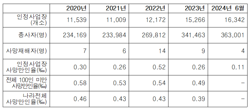 실제 이용우 의원실이 인정사업장의 사고사망만인율(사고사망재해자/사업장종사자*10,000)을 살펴본 결과, 이들 사업장의 만인율은 0.26~0.52 퍼밀리아드(‱)로 같은 규모 사업장(100인 미만) 전체의 사망만인율 0.49~0.58‱보다는 낮았다. 하지만 22년에는 전체 100인 미만 사업장과 거의 차이가 없을 정도로 만인율이 높았다. 심지어 나라 전체 만인율보다도 높아 제도의 효과가 의심되는 상황이었다.