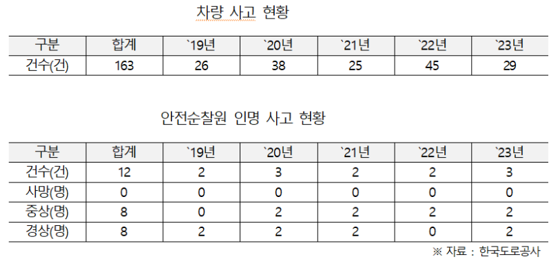 한편 최근 5년간 고속도로 안전순찰차 사고는 163건 발생했고, 안전순찰원 12명이 부상을 입은 것으로 확인됐다.