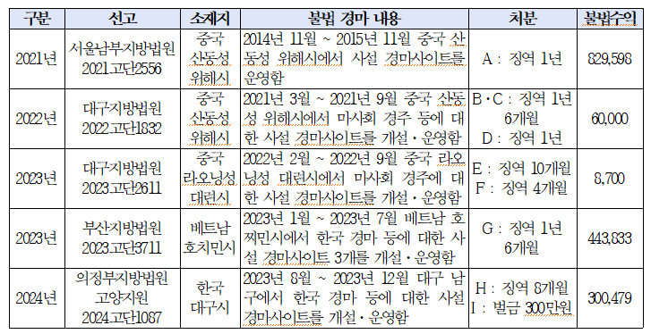 특히 문대림 의원이 최근 불법 경마 사이트를 개설·운영하다 처벌받은 판결문을 입수해 분석한 결과, 2021년과 2022년에 각각 중국 산동성 대련시와 라오닝성 대련시, 2023년에는 베트남 호치민시에서 불법 경마 사이트를 운영한 이들이 각각 대구지방법원과 부산지방법원에서 처벌받는 등 국내에서 단속을 피해 중국, 베트남 등 해외에서 불법 경마 사이트 운영하다 적발된 사례가 다수 있었던 것으로 확인됐다.