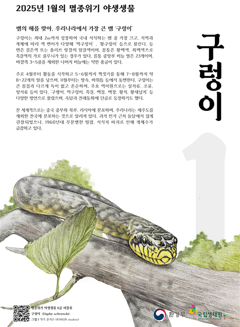 구렁이 등 멸종위기 야생생물에 대한 정보는 국립생태원 누리집 에서 확인할 수 있다.