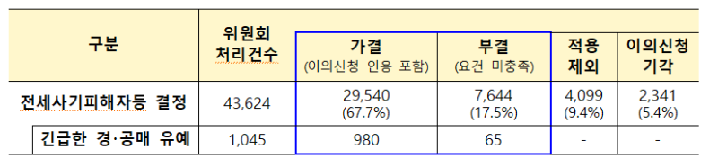나머지 1,031건 중 552건은 요건 미충족으로 부결되었고, 201건은 보증보험 및 최우선변제금 등으로 보증금 전액 반환이 가능하여 적용제외되었으며, 278건은 이의신청 제기 건 중 요건이 여전히 미충족되어 기각됐다.