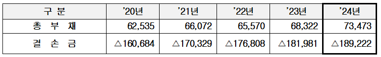공사의 총부채는 지난해 말 기준 7조 3,473억원으로, 결손금은 18조 9,222억으로 확인됐다. 또한, 지난 3년간 부채에 대한 오로지 이자 지출만 약 3천억원에 다다른다.