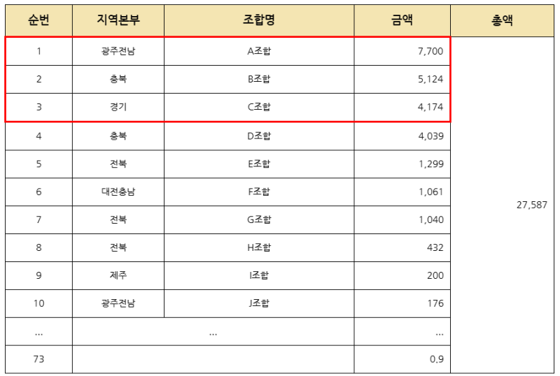 최근 5년간 경조사 참석에 여비를 지급한 신협은 73곳으로 지급총액은 2억 7587만 원이었다. 세부 여비 지급 현황을 보면, A조합 7700만 원, B조합 5100만 원, C조합 4100만 원이었으며, 이들 세 곳이 전체 경조사 여비 지급액의 61.6%를 차지했다.