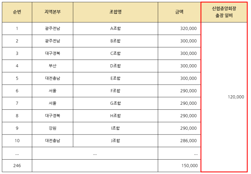 특히 교통비・식비・숙박료를 제외한 임원 일비 지급 기준만 따로 살펴보면, A조합 32만 원, B조합.C조합.D조합.E조합 30만 원, F조합.G조합,H조합.I조합 29만 원 등 15만 원 이상을 지급하는 신협이 246곳(전체 32.8%)에 달했다. 상당수의 조합이 현재 신협중앙회 회장의 출장 일비(최대 12만원)를 초과하고 있는 것이다.