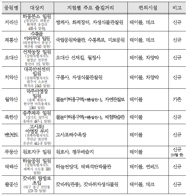 신규로 운영하는 숲 속 쉼터 9곳은 △지리산(하동분소 일원), △계룡산(수통골 야외무대 일원), △오대산(선재농장 일원), △치악산(대곡안전센터 일원), △북한산(송추계곡 일원), △변산반도(고사포3 야영장 부지), △무등산 (원효지구 일원), △태백산(하늘공원 일원), △팔공산(갓바위 탐방로 초입) 등이다.