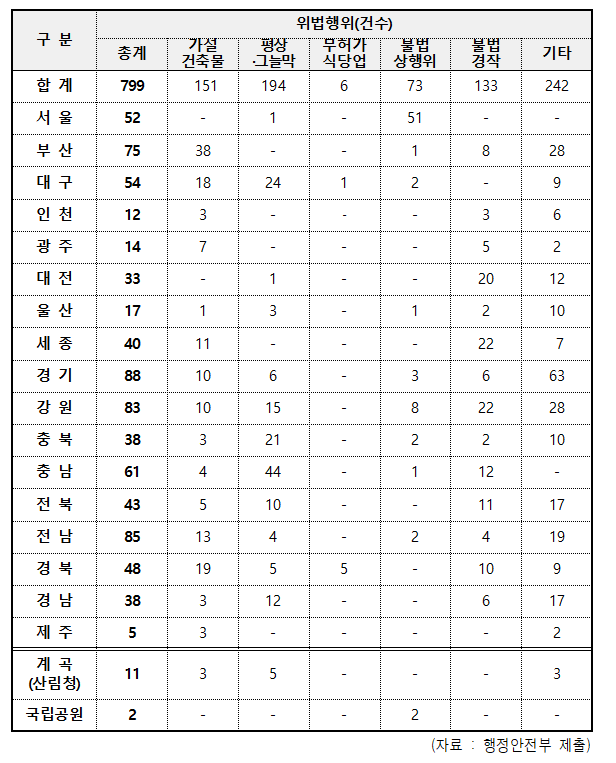 더불어민주당 한병도 의원(전북 익산시을, 국회 예산결산특별위원회 위원장)이 행정안전부로부터 제출받은 자료를 분석한 결과, 9월 2일 기준 지역별 적발 건수는 △경기 88건 △강원 83건 △전남 85건 △부산 75건 △충남 61건 순으로 나타났다. 휴양지·관광객이 집중되는 지역을 중심으로 불법 가설건축물, 평상 등이 대거 확인됐다.