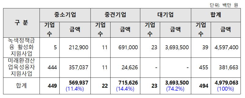기후에너지환경부 녹색융자 74%(3.7조원) 대기업 독식 - 자금여력이 부족한 중소기업 지원은 11.4% 불과