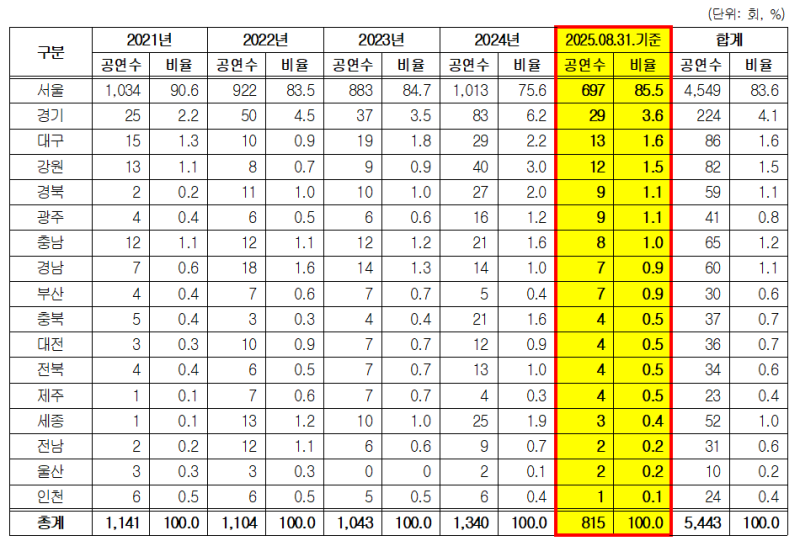 최근 5년간(2021~2025.8), 문체부 소속 국립예술단체 지역별 공연 실적