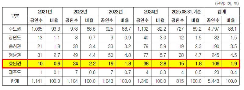 국회 문화체육관광위원회 소속 민형배 의원(더불어민주당, 광주 광산을)이 문화체육관광부로부터 제출받은 ‘최근 5년간, 문체부 소속 국립예술단체 공연 실적’자료에 따르면, 전국 17개 시・도 광역자치단체에서 열린 총 5,443회 공연 가운데 호남지역 공연은 106건(1.9%)에 그쳤다. 지역별로는 광주 41건(0.8%), 전북 34건(0.6%), 전남 31건(0.6%)으로 집계됐다.