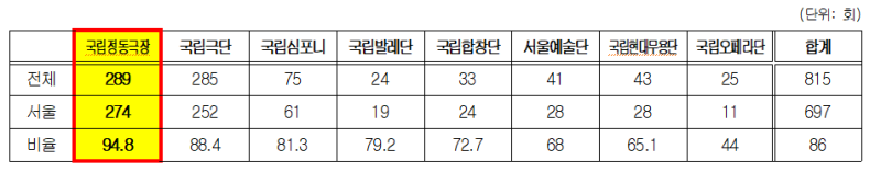 기관별로도 살펴봤다. 올해 서울공연 집중도는 국립정동극장이 가장 높았다. 전체 289회 중 274회가 서울에서 진행됐다. 약 95%에 해당하는 수치다. 다음으로 국립극단 88.4%, 국립심포니 81.3%, 국립발레단 79.2%, 국립합창단 72.7%, 서울예술단 68.0%, 국립현대무용단 65.1%, 국립오페라단 44.0% 순으로 서울 공연 비율이 높았다.