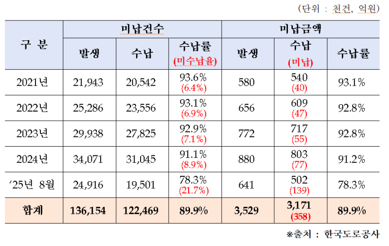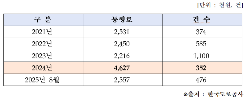 ▲ 고속도로 하이패스 미납통행료 수납현황(2021~2025.08)