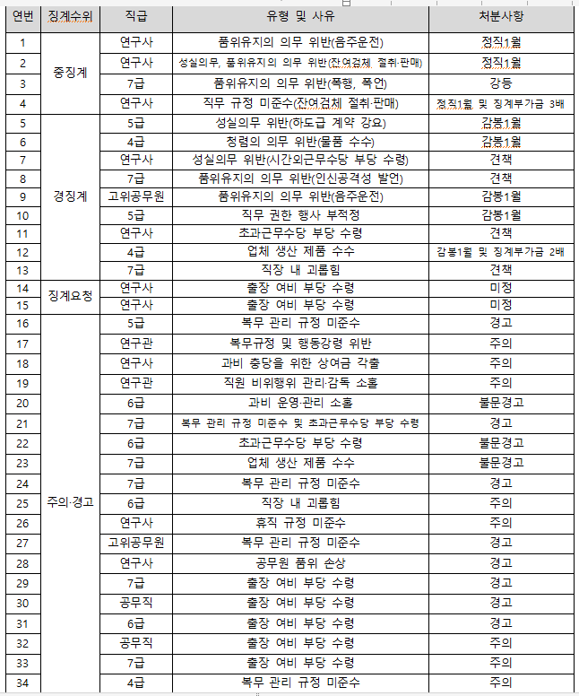 징계 유형별로는 △중징계 4명 △경징계 9명 △징계요청 2명 △주의·경고 19명으로 집계됐다. 연도별로는 2024년 17건, 2025년(1~9월)에도 17건이 발생해 2년 연속 비슷한 수준으로 적발됐다.
