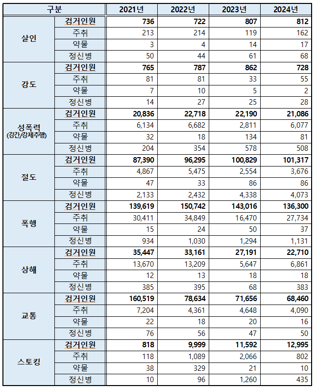 2021년부터 2024년까지 지난 4년간, 경찰에 검거된 총 158만여 명 중 23만 6천여 명이 범행 당시 ‘주취, 약물, 정신병’ 상태에 있었던 것으로 확인되었다. 이는 전체 검거 인원의 14.9%에 달하는 수치이다.
