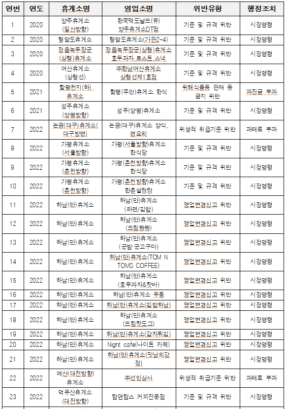 한국도로공사는 고속도로 휴게소 식음 매장의 위생점검을 지역본부별 반기 1회, 지사별 격월 1회의 주기로 시행하고 있다. 점검항목은 △식자재의 원산지표시 △조리장 및 직원의 청결 상태 △접객 구역 청결 상태 등이다. 점검 결과의 경중에 따라 주의·경고 등 계약상 조치를 내리고, 휴게소 운영서비스 평가에 반영해 개선을 유도하고있다.