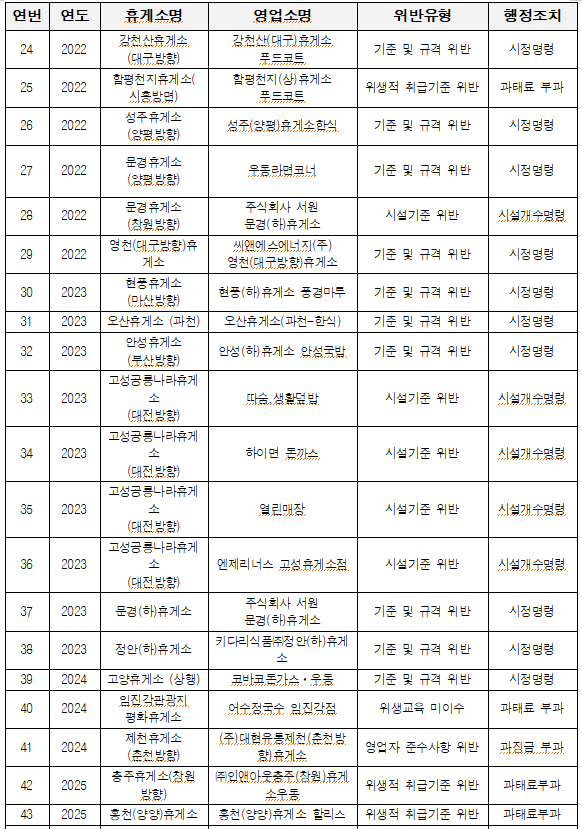 한편, '식품위생법'에 따라 식품의약품안전처 또한 고속도로 휴게소 식품접객업소에 대한 위생점검을 실시하고 있다. 송기헌 의원이 식품의약품안전처로부터 제출받은 자료에 따르면, 최근 5년간 고속도로 휴게소 식품접객업소의 '식품위생법' 위반은 총 45건으로 나타났다.