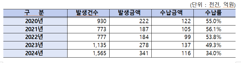 최근 5년간(2020~2024년) 부가통행료 부과 건수는 518만 건, 부과금액은 1,212억 원에 달했지만, 실제 수납액은 579억 원으로 절반에도 못 미쳤다. 또한, 부가통행료 수납률은 2020년 55%에서 2024년 34%로 큰 폭으로 하락했다.