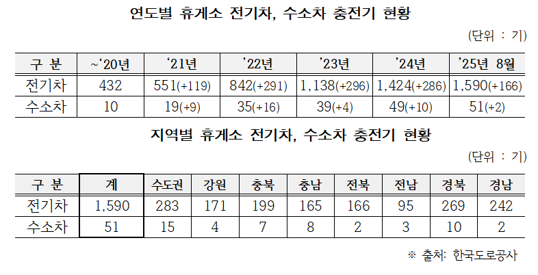 한국도로공사는 ‘미래를 여는 친환경 고속도로’를 목표로 전기차 충전기는 2024년 1,479기에서 2025년 1,800기로 확대하고, 수소차 충전소는 150km 이내 구간마다 1개 이상 구축하겠다고 밝혔으나, 실제 현실은 기대에 크게 못 미쳤다. 2024년 전기차 충전기 1,424기, 수소충전기 49기에서 2025년 8월 현재 각각 1,590기와 51기에 그쳐 확충 속도는 더딘 상황이다.