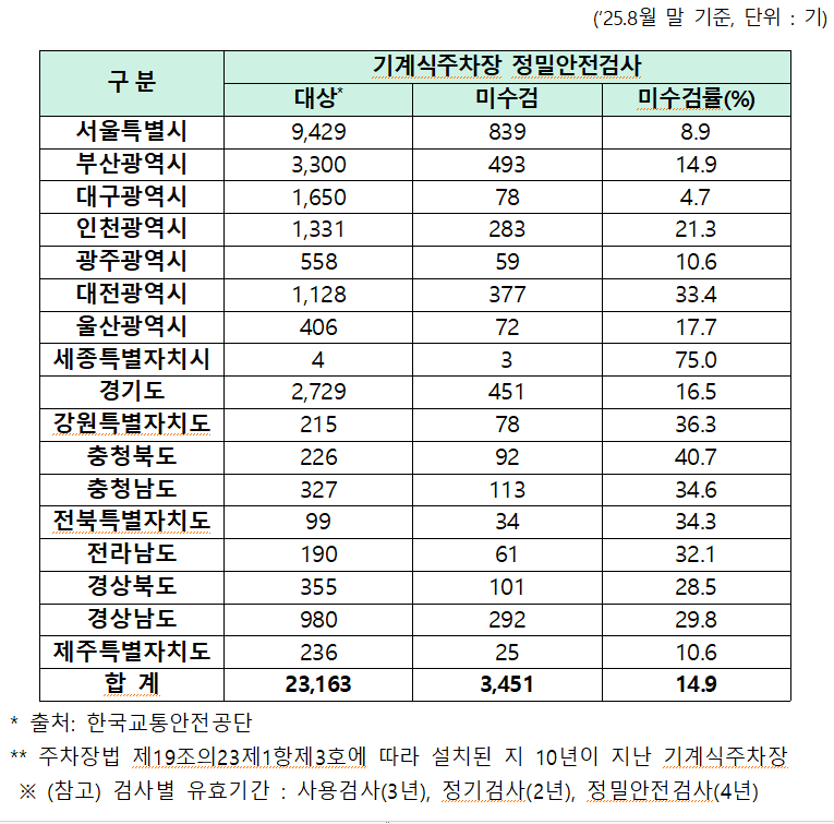 권영진 의원(국민의힘, 국회 국토교통위원회 간사, 대구 달서구병)이 한국교통안전공단(이하 ‘공단’)로부터 제출받은 「정밀안전검사 대상 노후 기계식주차장 정밀안전검사 미수검 현황」 자료에 따르면, 올해 8월 말 기준, 정밀안전검사 대상 노후 기계식주차장 23,163기 중 검사를 받지 않은 기계식주차장은 3,451기로, 전체의 14.9%에 달하는 것으로 나타났다.