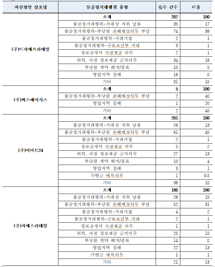 불공정거래행위 유형별로는 '부당한 손해배상의무 부담'이 370건(39.6%)으로 가장 많았다. '거래상 지위 남용' 134건(14.3%), '허위·과장 정보제공 금지의무 위반' 126건(13.5%)이 그 뒤를 이었다.