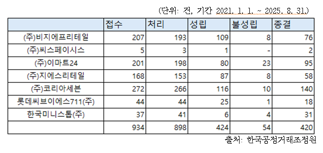 불공정거래 분쟁조정 처리 현황을 살펴보면, 최근 5년간 총 898건이 처리됐으며 이 중 424건(47.2%)이 불공정거래행위로 성립됐다. ㈜코리아세븐이 115건으로 가장 많았고, ㈜비지에프리테일 109건, ㈜지에스리테일 87건, ㈜이마트24 80건 순이었다.