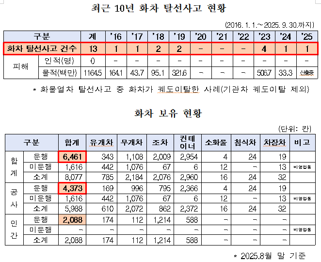 해마다 화물열차(이하 ‘화차’) 탈선사고가 발생하고 있는 가운데 막대한 예산을 투입해 다수의 화차에 선로 이탈을 감지해 비상 제동을 걸어주는 장치인 탈선감지장치를 부착하였으나 잦은 오작동으로 인해 이 장치를 끈 ‘차단 상태’에서 1년 이상 화차가 운행되어 온 것으로 드러났다.