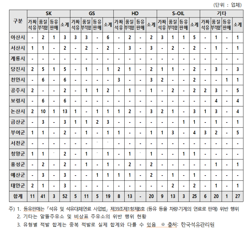 논산 24곳, 아산 17곳, 당진 13곳 순이었으며, 정유사별로는 SK에너지 52곳, S-OIL 25곳, HD현대오일뱅크 20곳, GS칼텍스 19곳이 적발됐다.