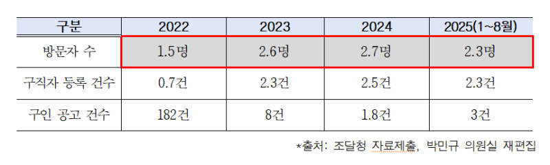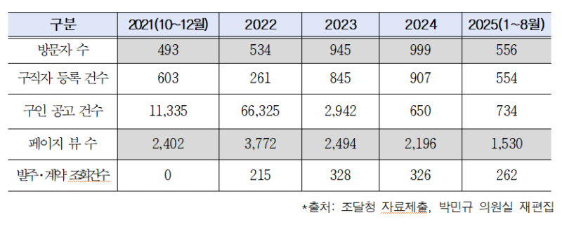 조달청은 구직자와 구인 공고 간 매칭 실적을 전혀 추적·관리하지 않고 있아 실제 채용이 얼마나 이뤄졌는지조차 확인할 수 없다. 발주계획·계약정보 조회 건수도 매년 200~300건에 불과해, 사실상 활용도가 없는 ‘유령 플랫폼’임이 확인됐다.
