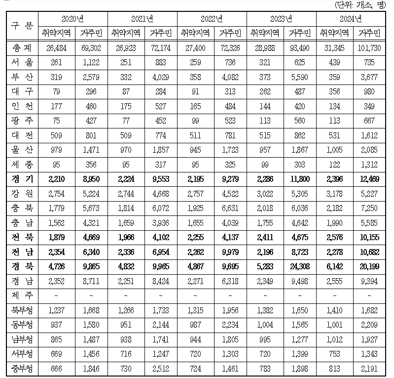 반면, 같은 기간 취약지역은 2020년 26,484개소에서 2024년 31,345개소로 18.4% 증가한 것으로 확인됐다.