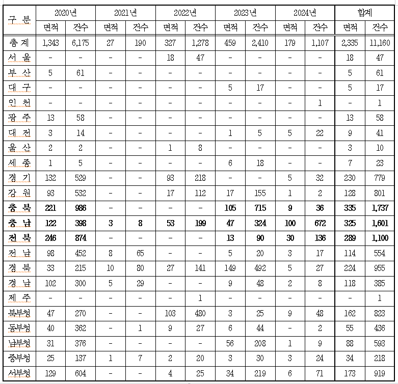 한편, 최근 5년간 지역별 산사태 발생 현황은 충북지역이 총 1,737건으로 가장 많았고, 충남지역 1,601건, 전북지역 1,100건으로 조사됐으며, 피해 면적도 충북지역이 335ha로 많았고, 충남지역 325ha, 전북지역 289ha 등의 순으로 나타났다.