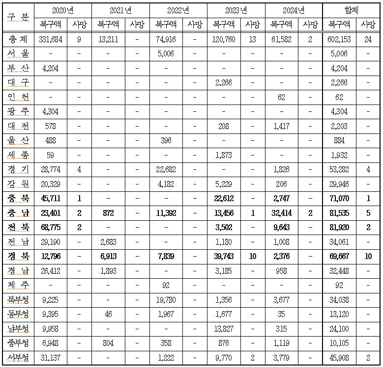 지역별 피해 복구액은 5년간 전북지역 819억 2,000만원, 충남지역 815억 3,500만원, 충북지역 710억 7,000만원, 경북지역 696억 6,700만원 등의 순으로 조사됐으며, 산사태에 따른 사망자는 경북지역 10명, 충남지역 5명, 경기지역 4명 등, 산사태에 따른 5년간의 총 피해 복구액은 6,021억 5,300만원, 사망자는 24명으로 조사됐다.