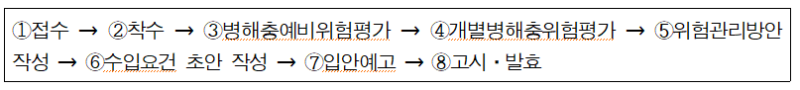 수입검역협상 절차는 접수단계에서부터 고시·발효까지 총 8단계로 이루어져 있다. 농림축산검역본부는 상대국이 공식적으로 수입허용을 요청하고, 위험분석에 필요한 자료를 제공할 때 접수(1단계)하며, 상대국이 우선순위로 진행을 요청할 경우 착수(2단계) 통보 후 수입검역협상을 진행한다.