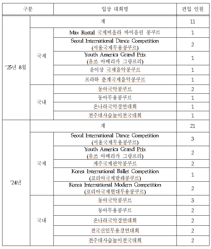 특히 최근 10년간 열린 참가자 전원이 한국인인 5개 국내 예술경연대회 대회 수상자 중 ▲ 동아국악콩쿠르 30명 ▲ 동아무용콩쿠르 16명 ▲ 온나라국악경연대회 18명 ▲ 전국신인무용경연대회 20명 ▲ 전주대사습놀이전국대회 24명 등 총 108명이 예술체육요원 특례를 받았다.