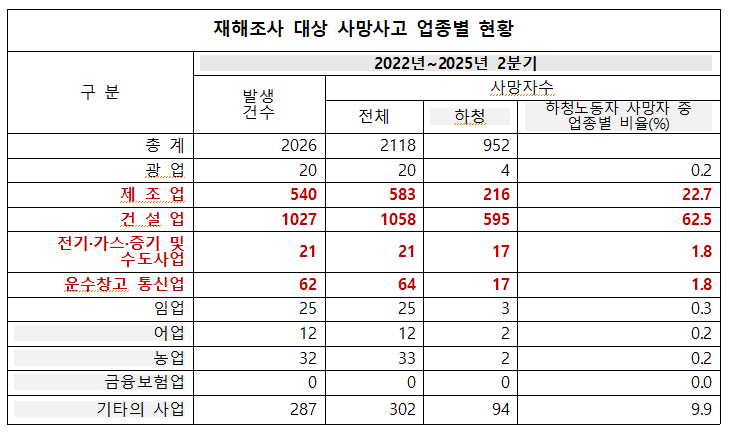 재해조사 대상 사망사고 중 하청노동자 비율은 2022년 44.1%(284명)에서 2023년 43.5%, (260명) 2024년 47.7%(281명)로 급증했다. 올해 2분기 기준 벌써 44.3%(127명)에 달한다.