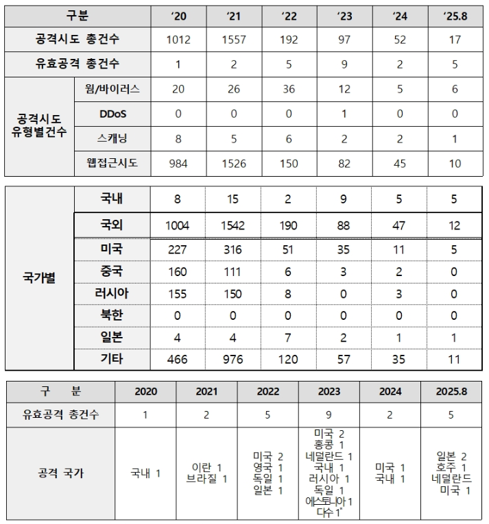한국은행에 대한 사이버 공격 건수를 연도별로 살펴보면 2020년에는 1012건, 2021년에는 1,557건, 2022년 192건, 2023년 97건, 2024년 52건, 2025년 8월 말까지는 17건이다. 그중 유효공격수가 가장 많았던 해는 2023년의 9건이다.
