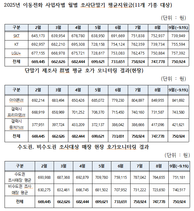 방통위의 모니터링 대상 11개 기종은 갤럭시 프리미엄群 6개, 아이폰群 2개, 갤럭시 중저가群 3종이다. 2025년 2월부터 9월(~9.19.)까지 群별로 분류한 현장 호가 모니터링 결과 아이폰은 84만원, 갤럭시 프리미엄은 74만원, 갤럭시 중저가는 42만원으로 나타났다.