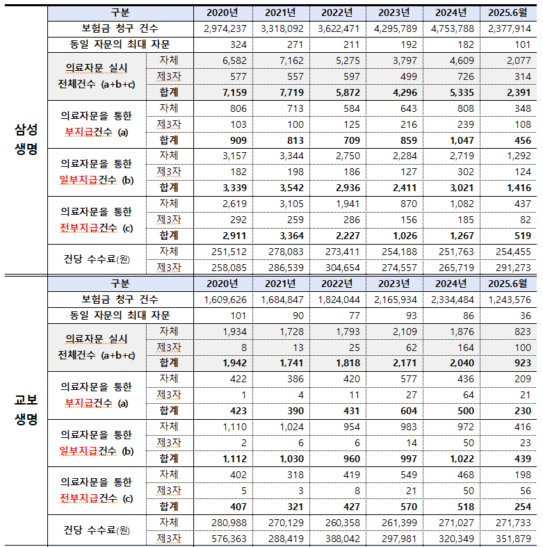 올해 상반기 기준 생보사 평균 자문료는 보험사 자체 선정 전문의가 건당 27만3460원, 고객이 선정한 제3자 전문의는 건당 31만9836원으로, 보험사 측 자문이 더 저가에 이뤄졌다. 자문비용은 전액 보험사가 부담한다.