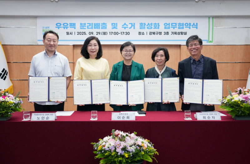 서울 강북구(구청장 이순희)는 9월 29일(월) 구청 기획상황실에서 강북구어린이집연합회와 어진이마을관리 사회적협동조합과 함께 우유팩 분리배출 및 수거 활성화 기반 구축을 위한 업무협약을 체결했다고 밝혔다.