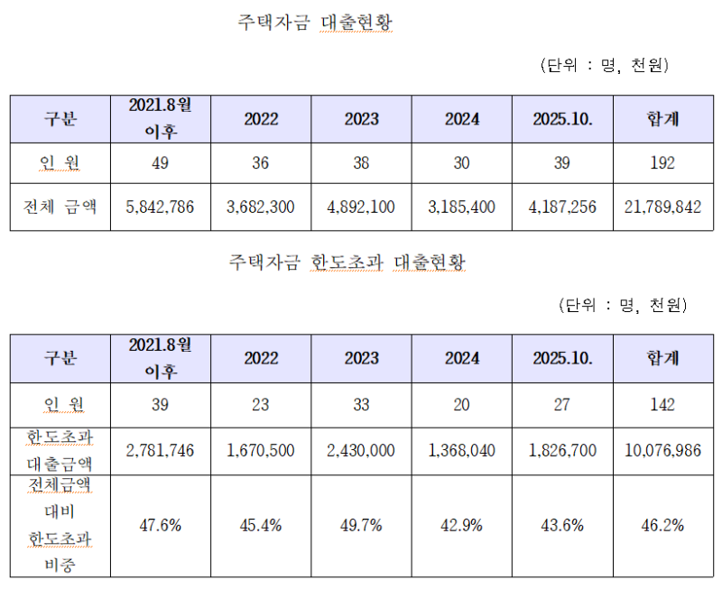같은 기간 전체 대출액은 생활안정자금 약 331억원, 주택자금 약 218억원이었다. 이 중 한도초과 비율은 생활안정자금 77.4%, 주택자금 46.2%에 달했다.