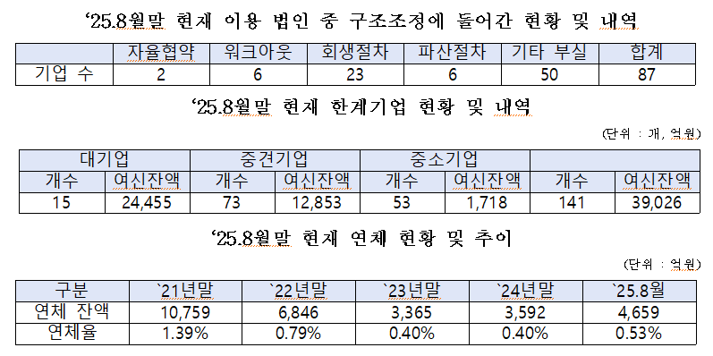 기업 구조조정 현황도 적지 않다. 올 8월 기준 수출입은행 여신을 이용하는 기업 중 87곳이 구조조정에 들어갔으며, 자율협약 2곳, 워크아웃 6곳, 회생절차 23곳, 파산 6곳 등으로 나타났다.