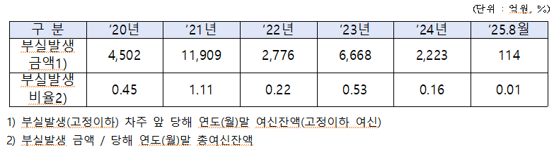 최근 6년간 부실채권 발생액은 2021년 1조 1,909억 원으로 정점을 찍은 뒤 감소세를 보였다. 다만 2023년에도 6,668억 원이 발생하는 등 하락 추세에도 불구하고 여전히 불안정한 모습을 보였다.
