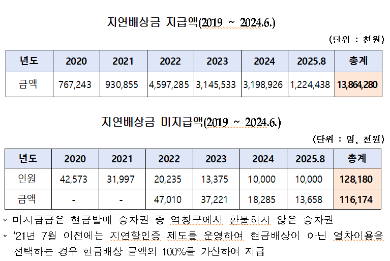 특히 2022년부터(이전에는 현금배상이 아닌 열차 이용을 선택하는 경우 현금배상 금액의 100%를 가산하여 지급) 현금 배상 제도가 도입된 이후에도 총 1억 1,617만 원의 미지급금이 발생해, 코레일의 미흡한 지급 관리가 도마 위에 올랐다.