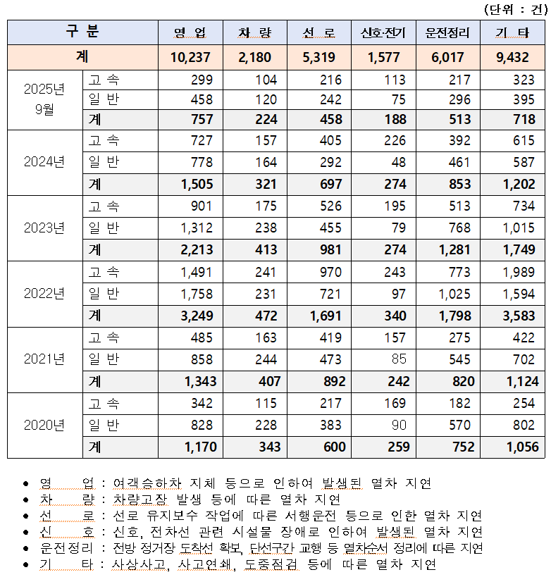 국회 국토교통위원회 정점식 의원(경남 통영시·고성군)이 코레일로부터 제출받은 <열차 주요 지연 사유> 현황 자료에 따르면 열차 지연의 주요 원인은 ‘여객 승하차 지체(영업, 29.4%)’, ‘사상사고‧도중점검 등(기타, 27.1%)’, ‘운전정리(17.3%)’, ‘선로(15.3%)’등에 의한 사유 순인 것으로 나타났다.